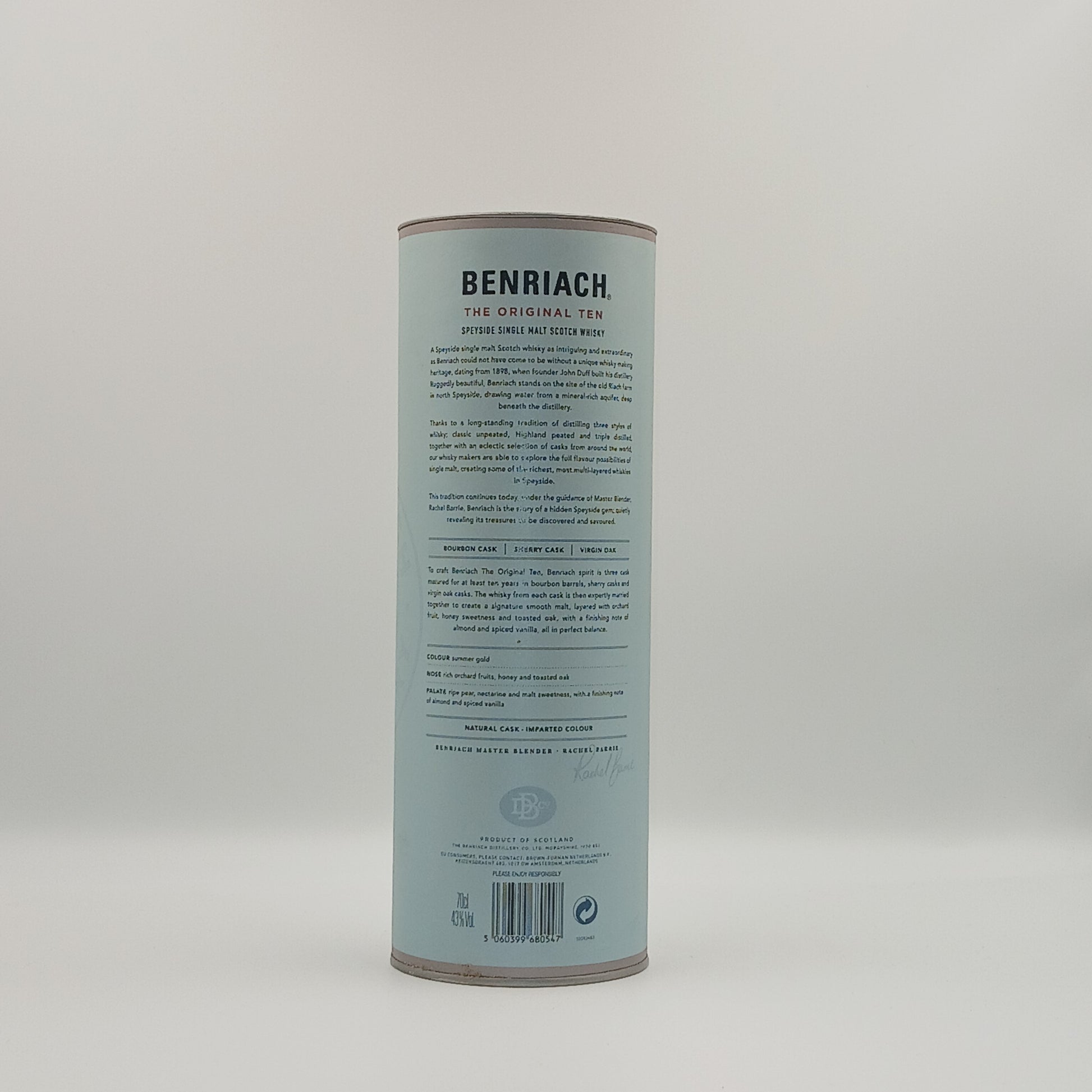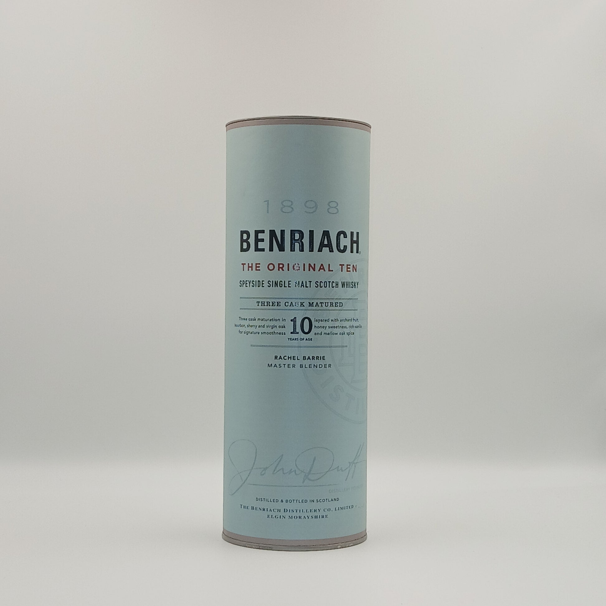 The Original Ten encapsulates the signature smooth and multi-layered character of Benriach. Three cask matured for at least ten years in bourbon barrels,sherry casks and virgin oak, to create layers of luscious orchard fruit, sumptuous honeyed malt and toasted oak, all interwoven with a subtle trace of smoke.The perfect introduction to our signature style and richly layered Speyside Single Malt.